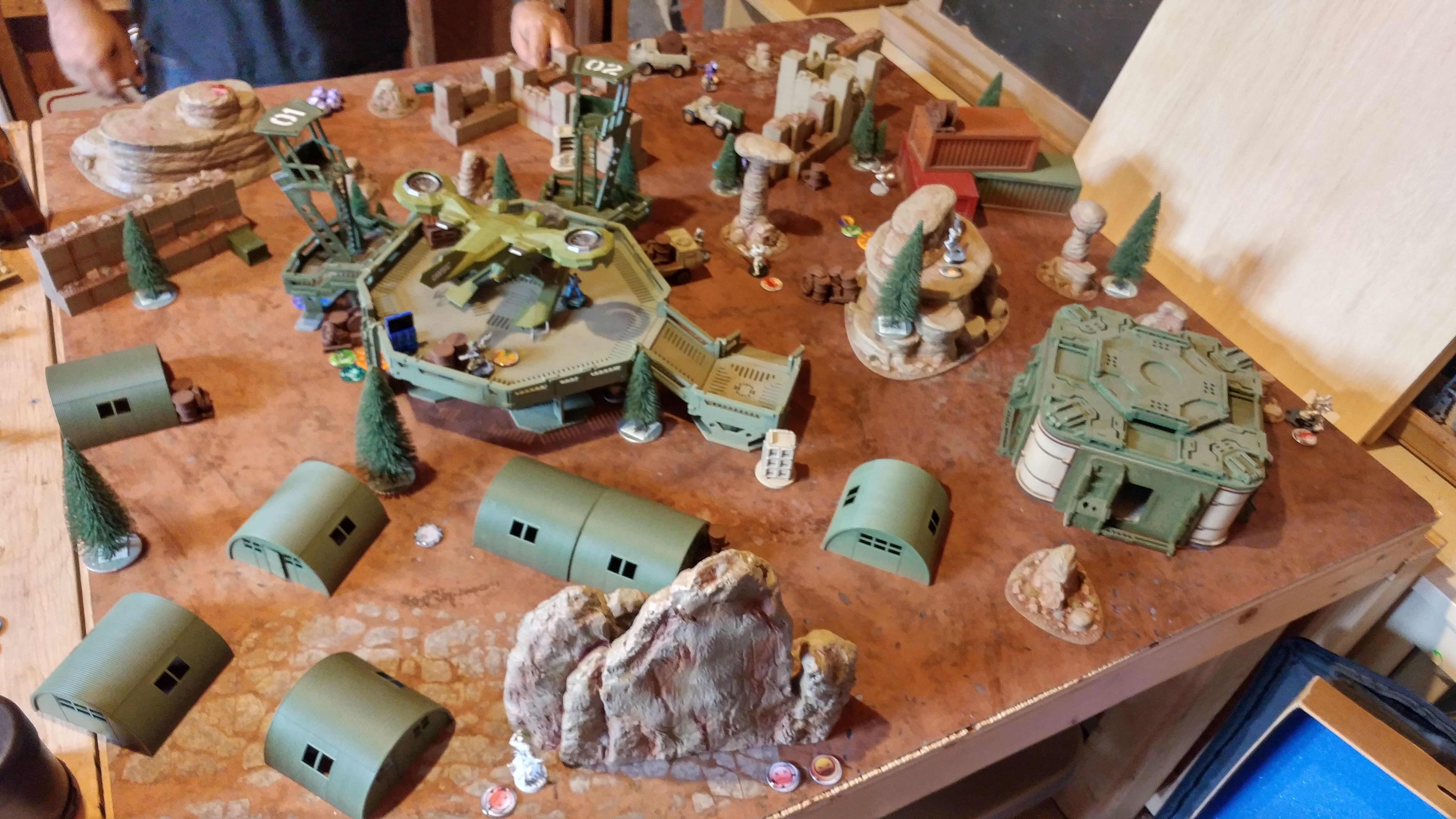 I deployed Morlocks on either side, with a Krakot and Moran reinforcing the right side. Lupe and my trusty Panzerfaust Jaguar lurked amongst the Quonset huts on my left, with my own TR Zond on the right backed up by a Kriza HMG. My Interventor Lt hid behind the armory building in the right side of my deployment zone, with my Zero atop the landing pad and the Bandit below it.