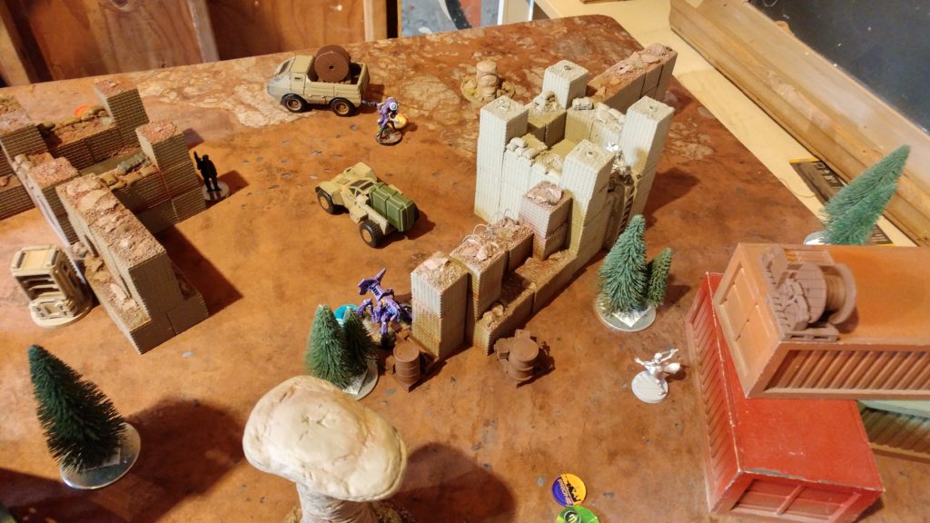 Adam has been on a Limited Insertion list kick for awhile, so he brought the pain today. His two Daturazi were on the flanks to provide smoke, and a Shrouded FO was next to each antenna. His Yaogat Spitfire hid in the HESCO barrier pillbox at the far side of this picture (his left, my right), with the Noctifier prone as a TO camo marker to provide overwatch. The Q-Drone made my life difficult on my right, along with the Ikadron over there to provide repeater coverage for buffing the Q-Drone.
