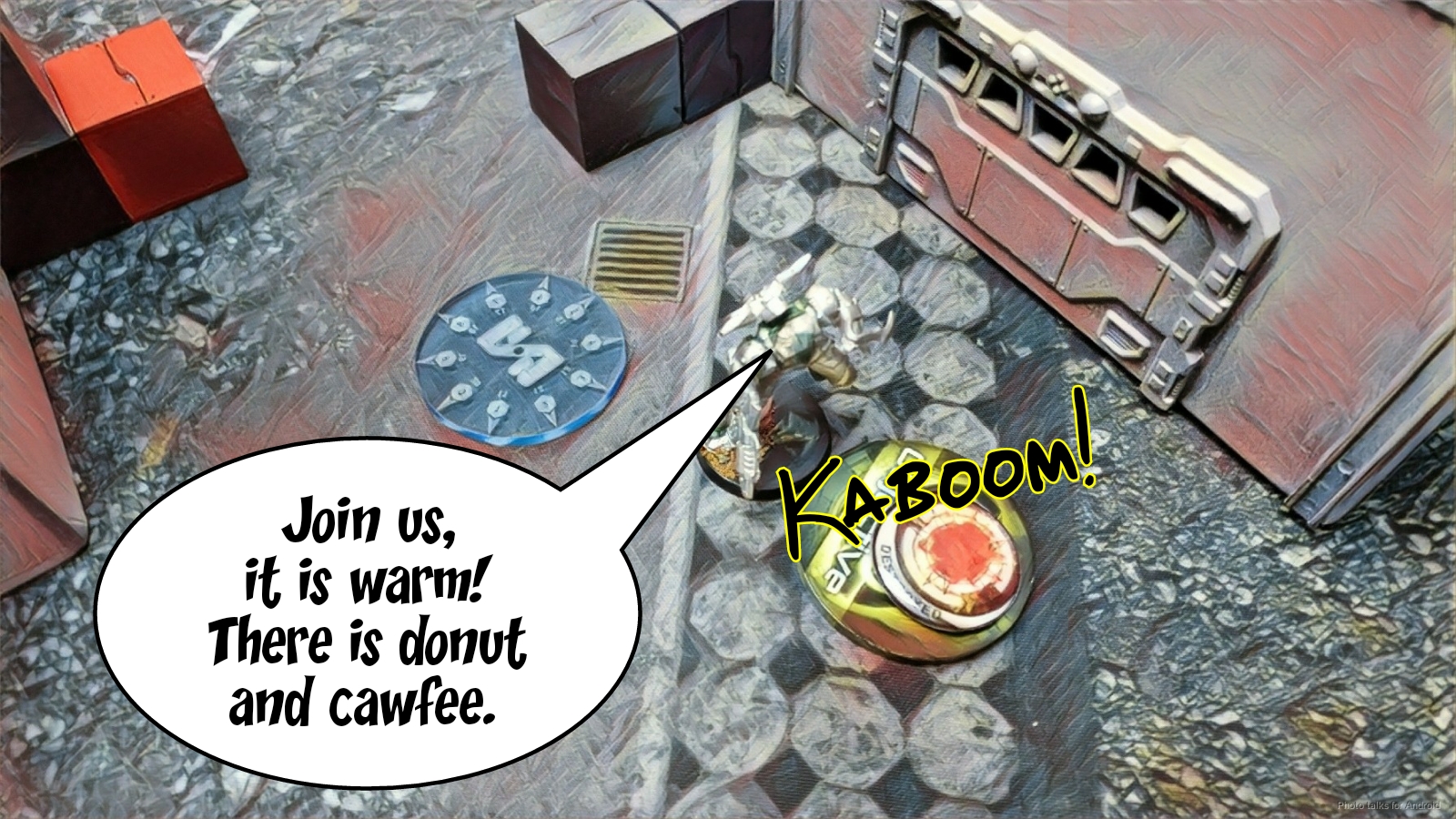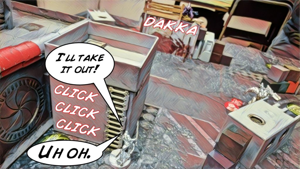 This doesn’t last against the Charontid’s plasma rifle though, and my Assault Pistol within 8″ loses to a storm of plasma rifle fire.