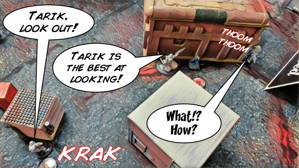 Tarik isn’t all the way in cover, so Adam buffs the Q-Drone and tries to take him out. I take a wound but finally manage to pass my guts checkto fall back into cover on Adam’s second attempt.