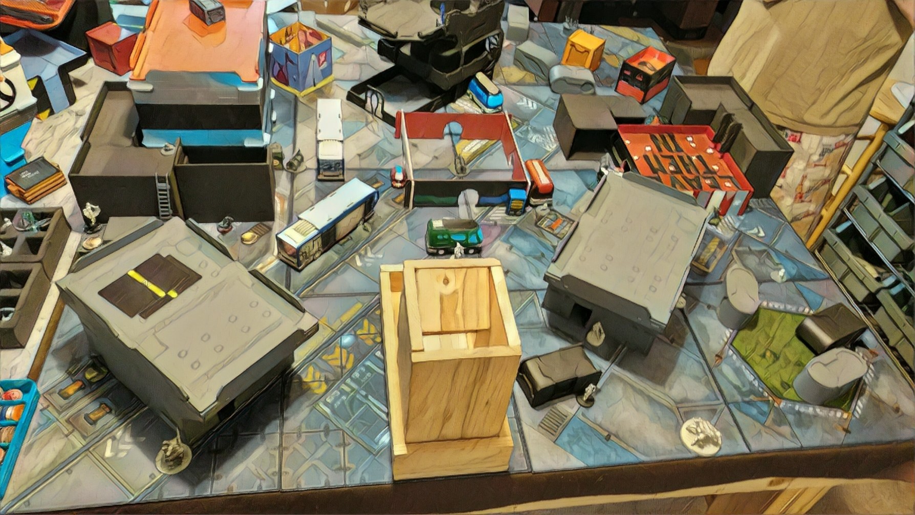 Alex put a Ninja KHD in the center of table, next to the central objective, and a Guilang FO next to the right objective (Alex’s perspective). To back up his TR bot, Alex throws a Guilang MSR on the roof of a tall building. At this point, he’s got 6 things down, with one in hidden deployment.