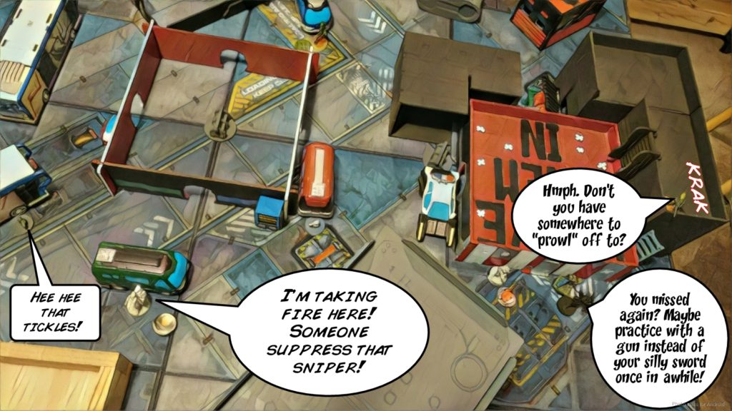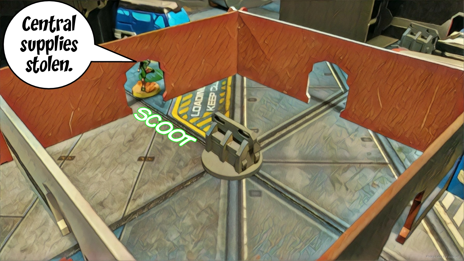 Alex spends the remainder of his command tokens converting orders and then spending them on coordinated orders, advancing his TR bot, Guilang MSR, and flash pulse bot and retreating the Ninja KHD and Guilang FO to the safety of the tall building in his deployment zone. Which has a convenient elevator. Great. At the end of the turn, the Guilang is a move away from the elevator and the Ninja (Alex’s new Lt) is sitting in it.