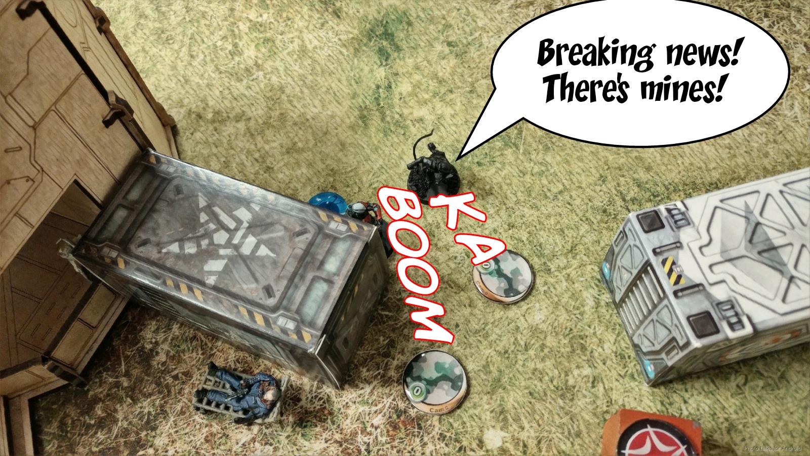 Nate started things off by breaking his link and declaring a coordinated order to attempt to discover my mine covering the Grenzer Spitfire. My infiltrated Metro (not with the DEP) can see this, but I don’t want to give the Kriza a shot on him.