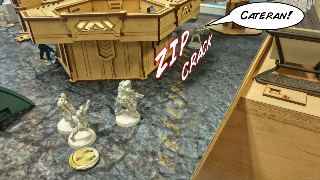 The Ninja is poking out quite a bit from the boxes, so I reposition a Farzan and take it out with some boarding shotgun shots with my last first group order.
