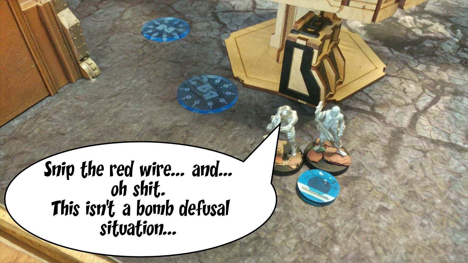 Adam loves his SAS CRAP and Uxia, so four camo tokens went down in the midfield, ready to cause havoc. He put two SAS CRAP and Uxia on the same side as my Ghulam link to give himself some redundancy there, and then threw a SAS CRAP on the left for good measure. He saw a keyhole through which he could shoot my Asawira, so he put a Cateran down there. The other Cateran (gross) came down in a position to take out my Ghulam ML when it was time. I responded by putting down my Fiday in view of Uxia but out of view of everything else, planning to take out the Grey, the Paramedic, and hopefully Wallace before I lost it. I forget what Adam held in reserve. I think it was one of the SAS CRAP.
