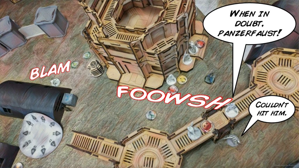No matter, I poked around the corner and let Wallace have both barrels, so to speak. Adam did some quick math, and decided that he could probably tank one of the two shots and just go into NWI, so he elected to flamethrower back. Of course, I roll two 19’s on my shotgun, missing, and die to the flamethrower. Whoops!