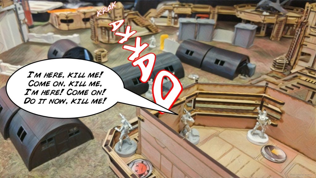 This gives Adam a window to get his Grunt Molotok (also a Doctor) into base to base with the SAS CRAP that had been fooled by the Farzan’s mine earlier. Of course, Adam’s dice luck (or lack thereof) holds and he kills the SAS.