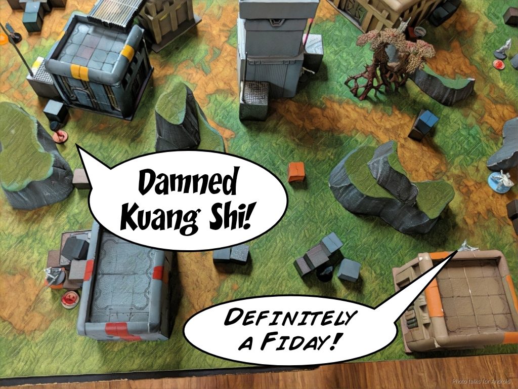 Erik’s failed attempt to remove my Lieutenant with the Ragik I think was a bit poorly executed. He knew it too–he was saying that it was more for the laughs than anything else. I think a stronger play would’ve been to drop him on the ground floor at the back table edge, then slowly pie slice using the hill and take out my Kuang Shi with full burst 3 per Kuang Shi.