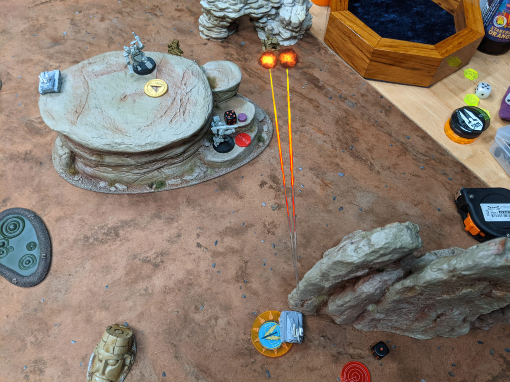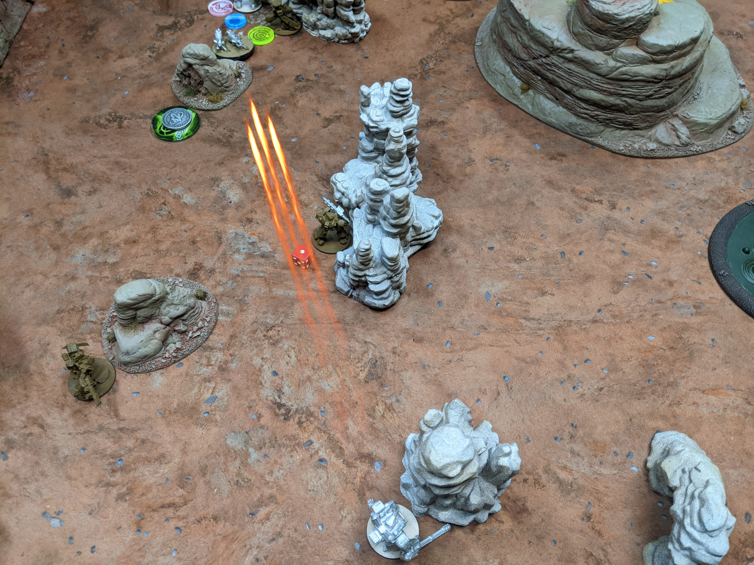 Adam activates his only remaining Ferret, mostly to just have a null activation, and then I drop a bunch of rockets on it and its friends, taking out his RC group for good. We’re finishing up turn 2 now, and I’ve got a full 2 activations on him. Things are looking okay.