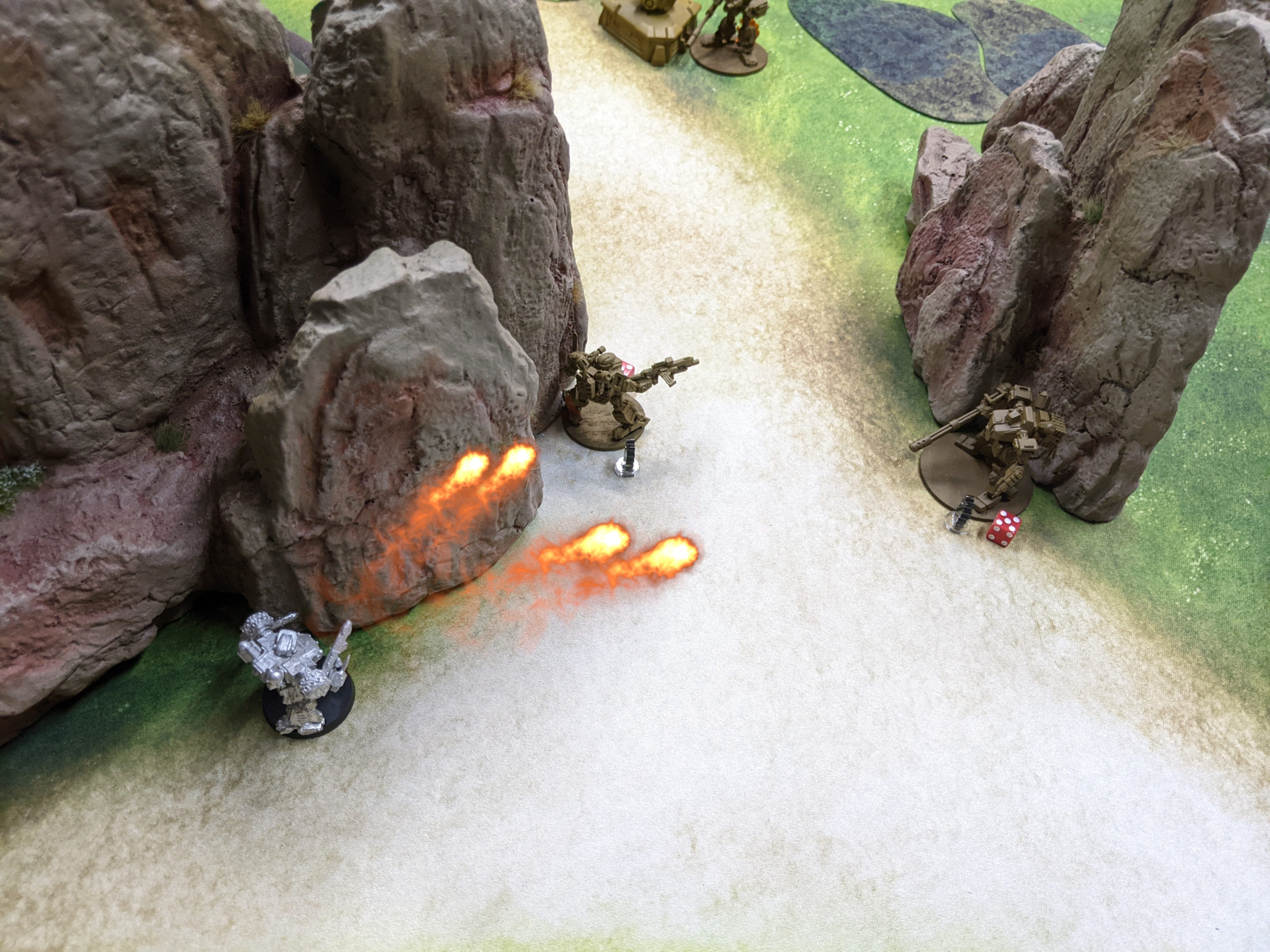 I think the other thing that gave me an edge was Adam’s tendency to split up his combat group members around the table. I think a lack of ECM encouraged this, and while it looks good from a board coverage perspective, it does mean you only have one shot sometimes. For example, Adam’s Razorbacks were on opposite sides of the table. If one shoots at one of my models and misses, the other can’t try again. Since it takes an average of 2 successful hits to kill most things in this game, this means it might take all four turns of shooting at my forces with multiple different elements of different combat groups. While the end result is the same, i.e. my model is dead, the fact that it’s not dead in a single combat group activation allows me to retain and extract utility.