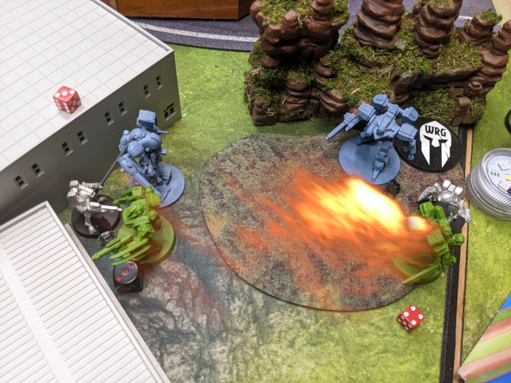 Like my first activation of the first turn was throwing a Warlock, the Griffin, and the Gargoyle at a Nemesis Jaguar. failed the hack, 5d6 versus 3d6 on the LGL didn’t hit the Jaguar from the Griffin, and then the MFG on the Gargoyle didn’t hit either. I could’ve focused the FG but I threw the MRP at him with the second action, still nothing. 3d6 versus 3d6 twice–you’d think i’d get past the agile once, but nope. Then it was just me trying to open the door to taking out the cobra/crusader and failing 2 hacks, a bunch of grenade fire, and I think 3 melee attacks on the iguana.