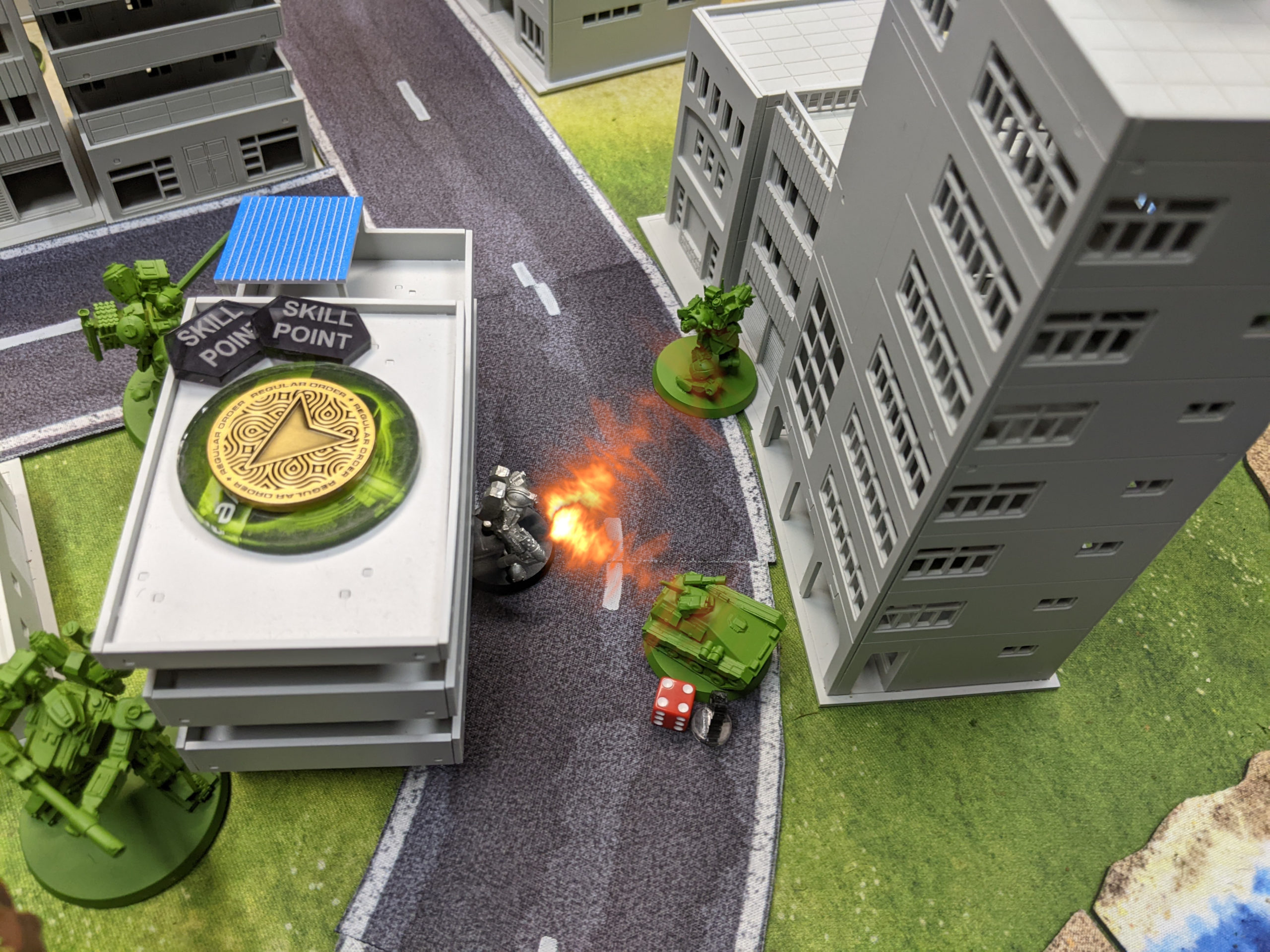 The other Agni grabbed the Raid objective on the left, which was a huge mistake, as it gave Adam all 4 turns to target and kill it. He started almost immediately by firing the Xyston Crusader’s FG at it thanks to some fancy footwork from the Iguana FOing. MOS 1 put four points of damage on my Armored Agni.