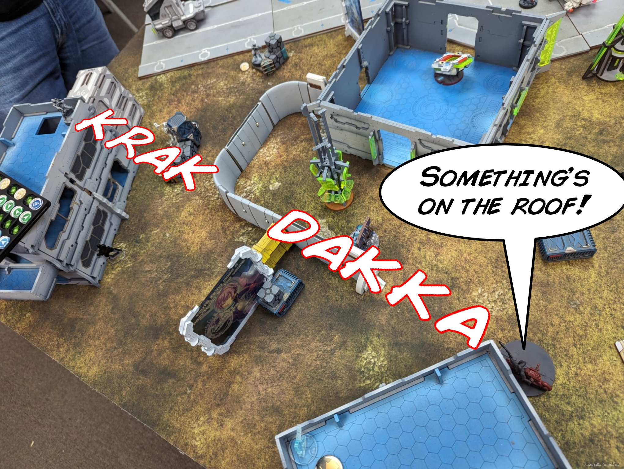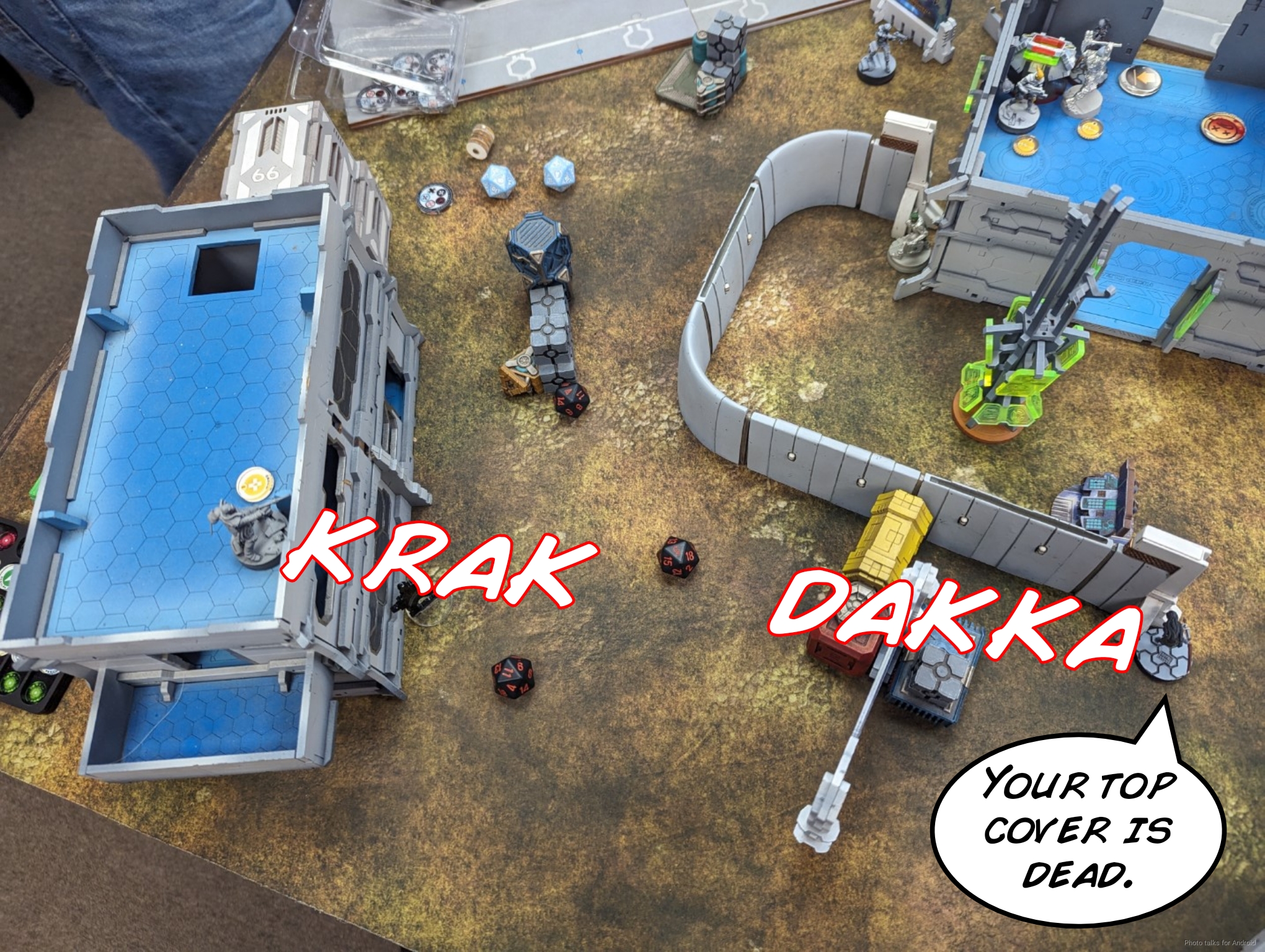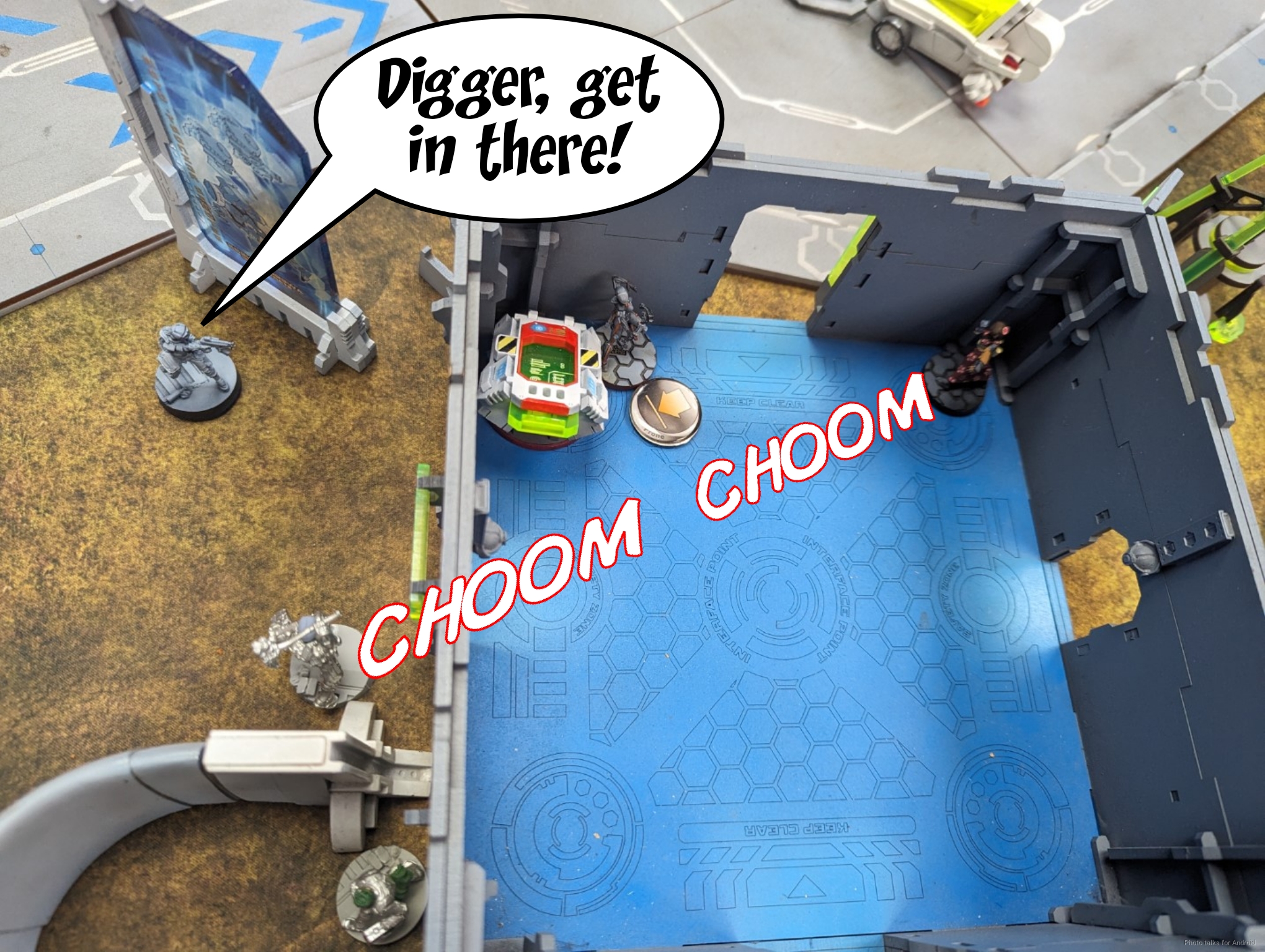 The Digger moves in to try and hit the Ninja in CC. It’s just out of movement range, so Adam settles for taking another chain rifle shot on the Karakuri, doing another STR taking the Karakuri to 1, but the Karakuri manages to drop the DIgger.