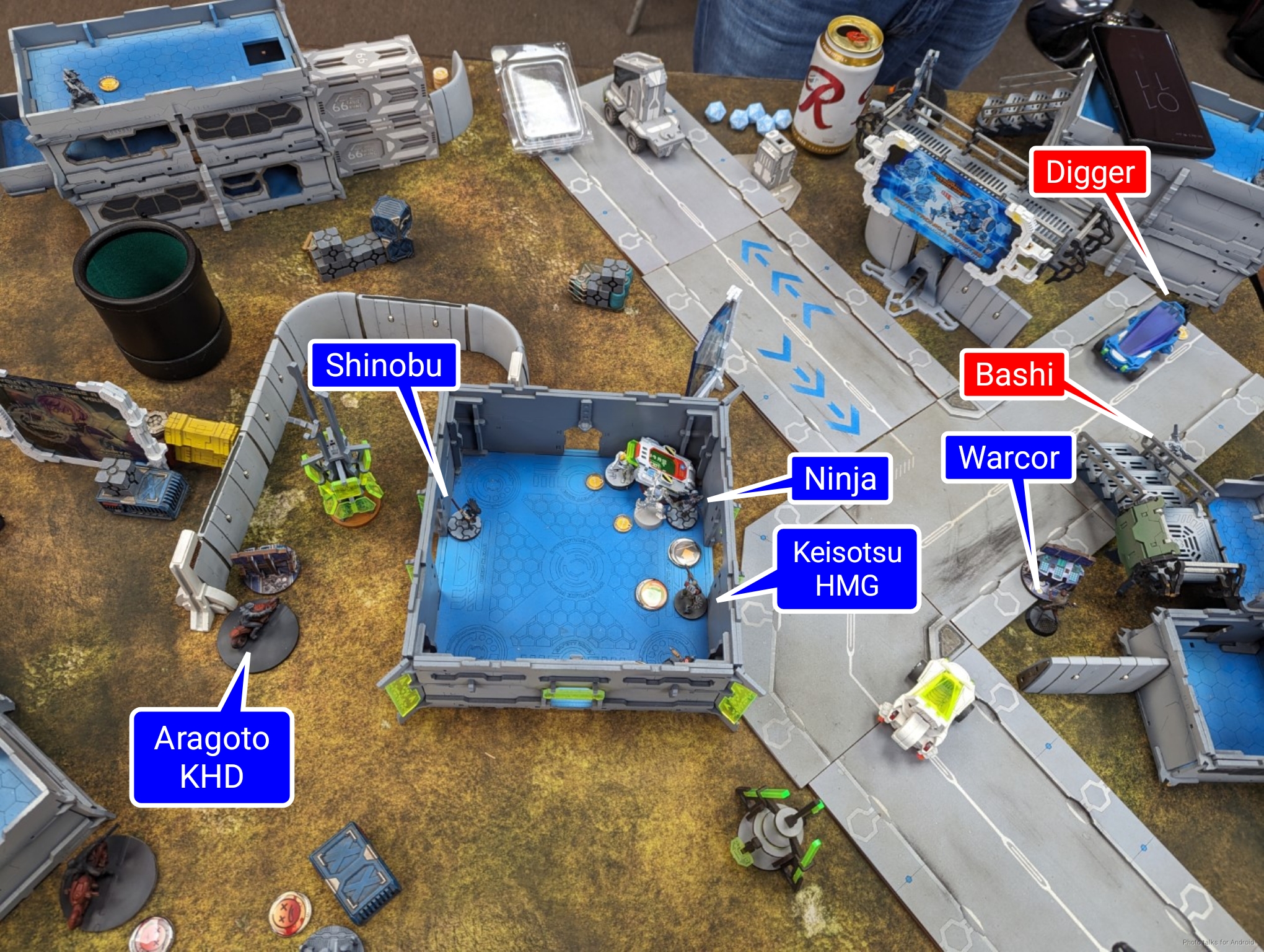 Adam took deployment to force me to take first turn, so I obliged. This was going to extra difficult for B-Pong, since the mission tends to favor the second turn, but I figured it would be better than trying to survive whatever Ikari could throw at me in an alpha. The armory really chopped the table up, which helps, but that meant I could lock down the very open right side with the Tanko ML and the Warcor. I put the bikes on the left to take advantage of the relatively closed approach which would favor their speed. I stuck the Keisotsu HMG in the central building in my DZ to be a backup gun in the center of the table–similar plan with the Domaru. The rest of the stuff was just sort of around. I held both Shinobu and the Karakuri in reserve.